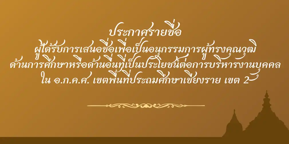 ประกาศรายชื่อผู้ได้รับการเสนอชื่อเพื่อเป็นอนุกรรมการผู้ทรงคุณวุฒิด้านการศึกษาหรือด้านอื่นที่เป็นประโยชน์ต่อการบริหารงานบุุคคลใน อ.ก.ค.ศ. เขตพื้นที่ประถมศึกษาเชียงราย เขต 2